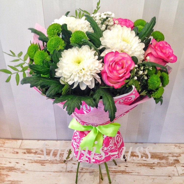 •Хризантема одноголовая 3 шт • Хризантема кустовая 3 шт • Роза 3 шт • Гипсофила 1шт • Писташ • Крафт • Фетр • Лента