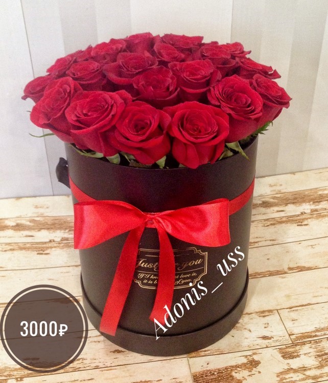 Роза красная, 50 см 23 шт • Коробка круглая •Лента Оазис