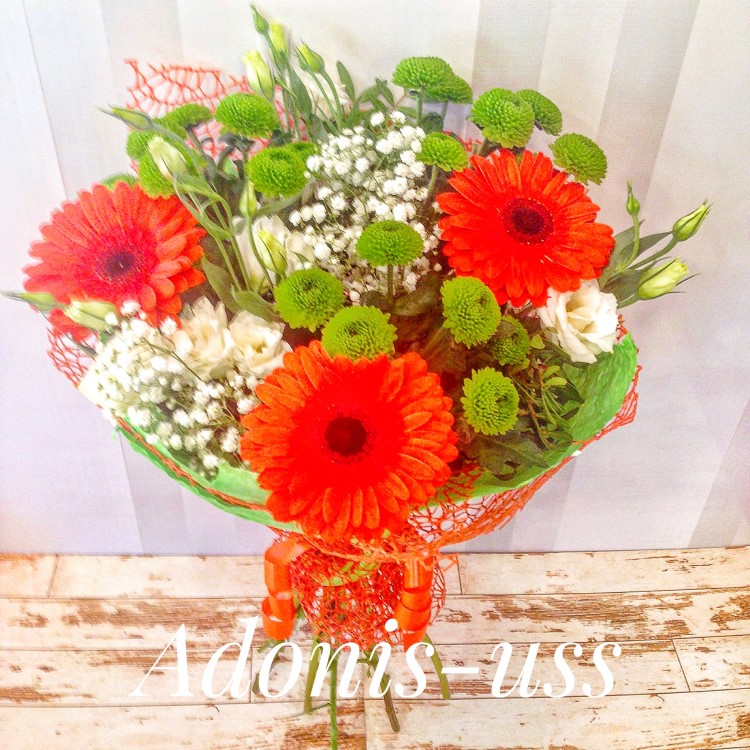 Гербера 3 шт • Хризантема кустовая 3 шт • Эустома 3 шт • Гипсофила 1 шт • Сизаль • Фетр • Лента