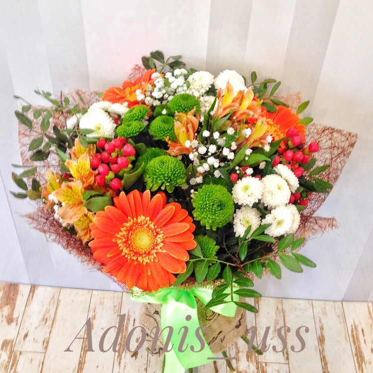 Гербера 3 шт • Хризантема кустовая 5 шт • Гиперикум 2 шт • Альстромерия 3 шт • Писташ • Сизаль • Лента • Гипсофила 1 шт