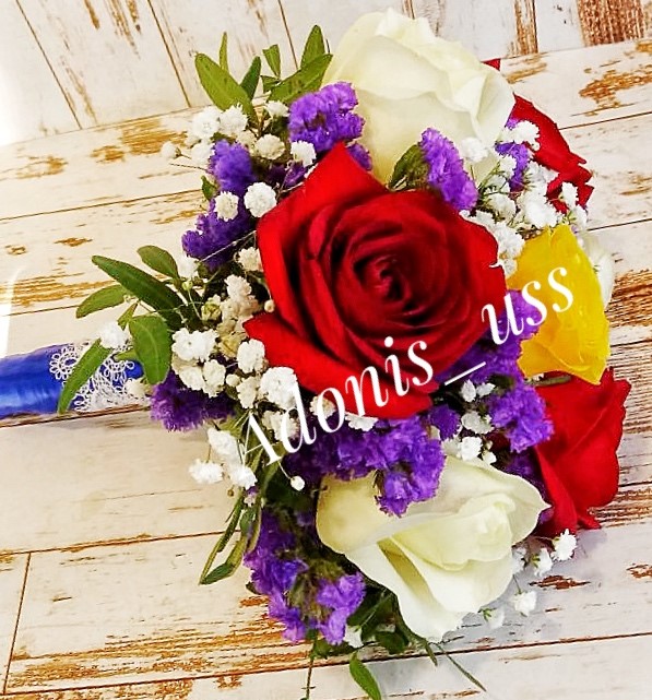 Роза 9 шт • Гипсофила 1 шт • Статица 2 шт • Писташ • Салал 5 шт • Лента • Кружево • Декор-бусина 1 шт • Портбукетница 1 шт