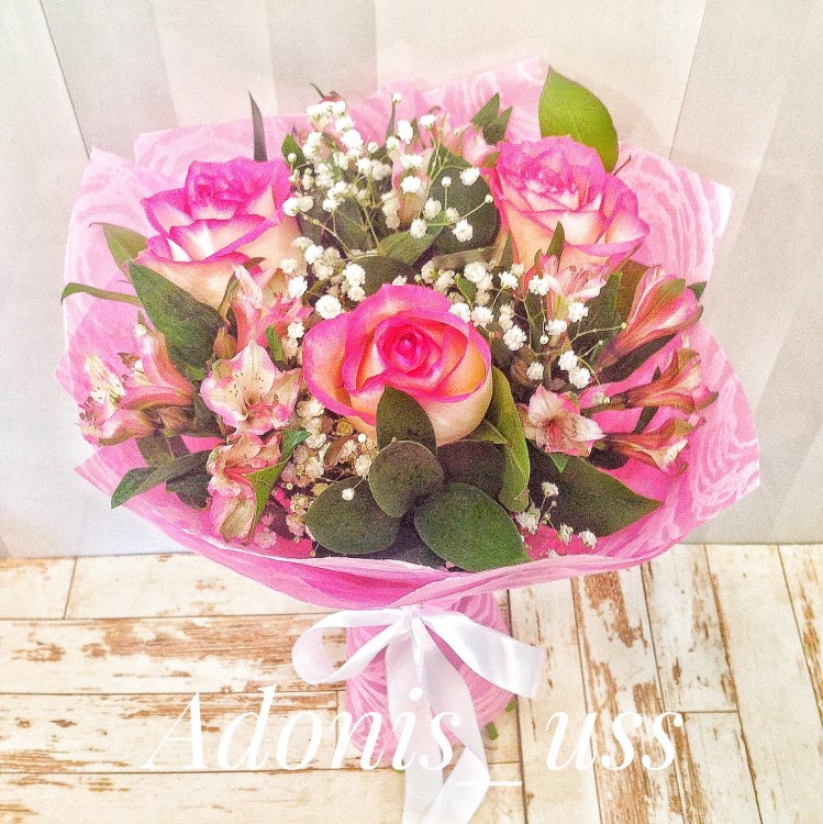 Роза 3 шт • Гипсофила 1 шт • Альстромерия 3 шт • Рускус 6 шт • Фетр • Лента