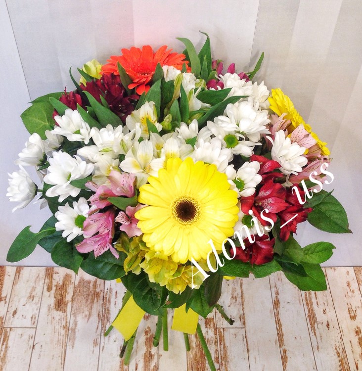 Гербера 3 шт • Хризантема кустовая 5 шт • Альстромерия 9 шт • Салал 0,5 • Лента