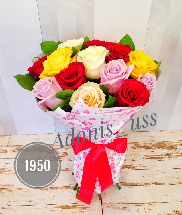 Роза красная 4шт• Роза белая 3шт • Роза розовая 3шт• Роза кремовая 3шт • Роза желтая 2шт • Бумага упаковочная • Лента
